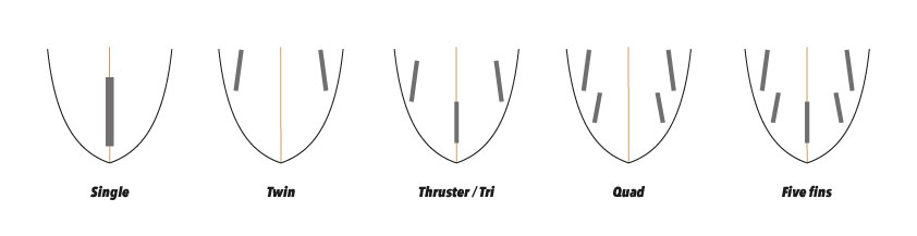 Thruster / Tri fins - 요즘은 3 개의 핀 이 가장 일반적인 구성이며 다양한 서프보드 모양과 크기에서 찾을 수 있습니다. 두 개의 외부 핀은 보드 중앙에 더 가깝고 보드 중심 쪽으로 기울어져 있고 ( "Toed-in ") 속도를 높이기 위해 안쪽에 평행하게 놓일 수 있습니다. 센터핀은 테일에 가장 가깝고 안정을 위해 양쪽에서 대칭의 위치에 (중앙에) 자리 잡습니다. 트라이 핀은 안정성, 제어 및 기동성을 추가하는 기능을 가집니다. 좀 더 부드러운 라이딩을 원하는 경우 트윈 또는 싱글을 타십시오!