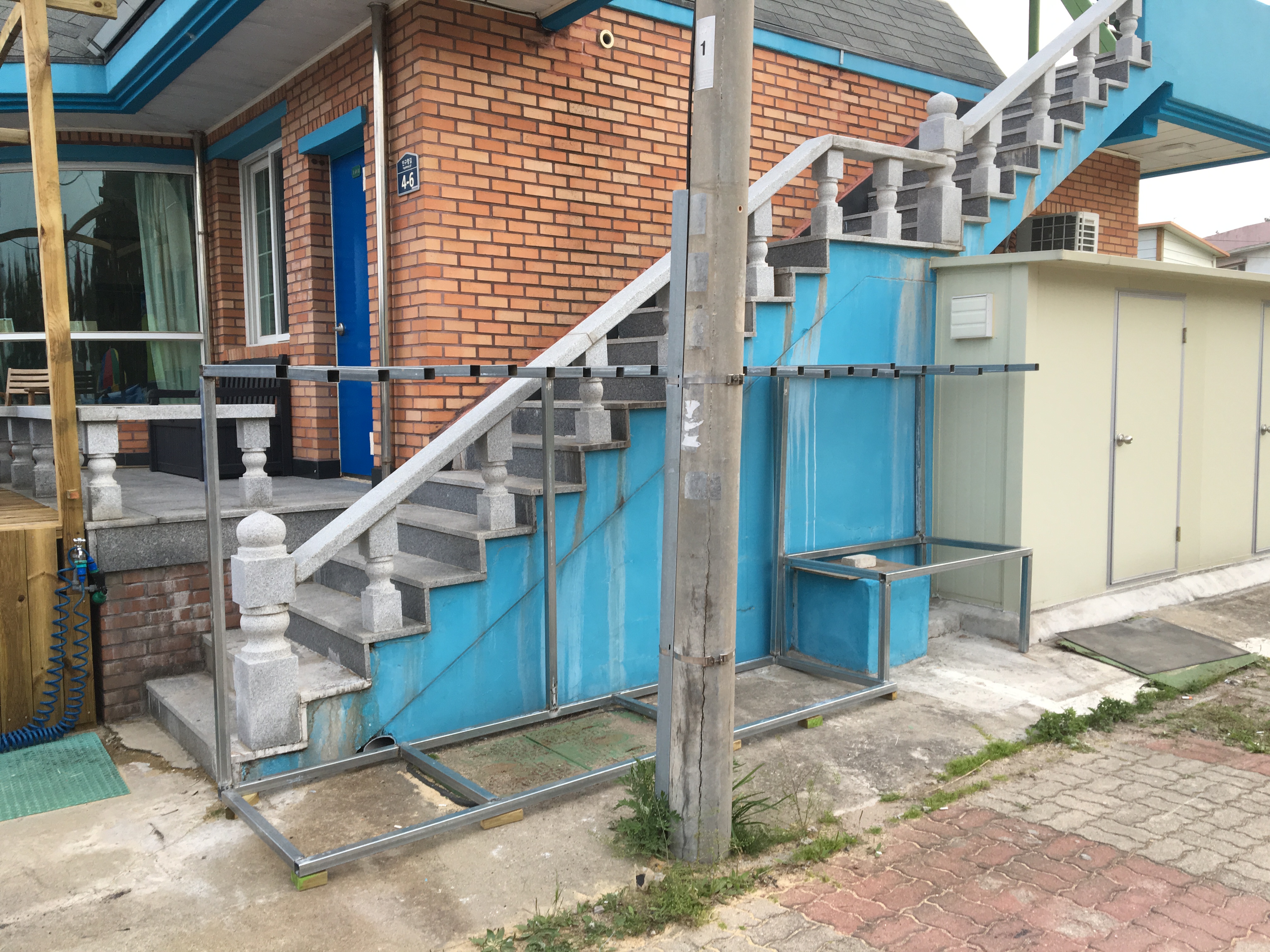 이후에는 외부에 서핑 교육용 보드를 보관 하기 위한 거치대를 아연 각 파이프로 만들어주었고,